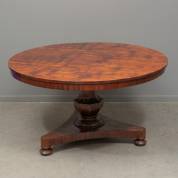 Ronde mahoniegefineerde tafel, de gekante poot rustend op driespant, 19e eeuw -herstellingen en wat fineerschade aan poot-, 71 × Ø 130 cm