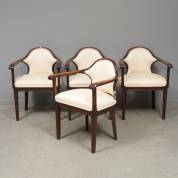Set van vier mahonie armstoelen met geruite crèmewitte bekleding, circa 1900 -gebruikssporen-