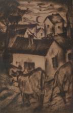 Oskar Gawell (1888-1955), grazende koeien bij door maan verlicht dorp, ets, r.o. gesigneerd -vochtplekje bovenin-, 21 × 13,5 cm