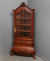 Wortelnotengefineerde hoekvitrinekast met roedeverdeling in de beglaasde deur, de onderkast met klep en lade en staand op bolklauwpoten, laatste kwart 20e eeuw, 212 × 107 × 55 cm