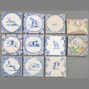 Negen aardewerk tegels met blauw-witte dierendecors, en twee met polychroom dierendecor, waaronder een randtegel -randbeschadigingen-