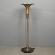 Metalen staande lamp met strak lijnendecor, op ronde gezwart houten voet, art deco -aanslag en corrosiestipjes-, 174 × Ø 53 cm