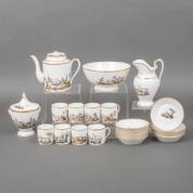 Porseleinen theeservies met vergulde biezen en geschilderde landschapsdecor, Zuiderlijke Nederlanden, 19e eeuw, bestaande uit: theepot, roomstel, spoelkom, acht kop-en-schotels, en drie losse schotels -suikerpot gelijmd, bonbonschaal met haarlijn in de bodem-