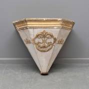 Witte en vergulde houten wandconsole, centraal monogram AM of MA met bloemguirlandes, op de facetten Heilige Harten en rozetten, eind 18e eeuw -gebruikssporen, enkele defecten-, 44 × 54 × 40 cm