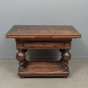 Kleine eiken bolpoottafel met uitschuifbaar blad, waaronder een lade, de poten verbonden door planken, 17e eeuw, 81 × 111 × 68 cm