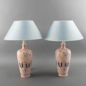 Paar rechthoekige massieve glazen tafellampvoeten met witte kappen, modern -één stekker ontbreekt-, totale maat 84 × 35 × 18 cm