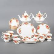 Aardewerk theeserviesgedeelte, decor Old Country Rose, uitvoering Royal Albert, Engeland, bestaande uit: twee theepotten, roomstel, taart- en cakeschaal, zes taartbordjes, vijf theekopjes en zes schotels, roomkannetje en vaasje, hoogte theepot 18 cm