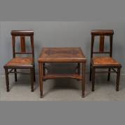 Coromandel salontafel en twee stoelen, deels massief hout, deels gefineerd, art deco, verkoopadres: Phoenix Meubelen, Damrak 76, Amsterdam, jaren '20, de stoelen met uitneembare lederen zitting, het blad van de salontafel met geometrisch patroon en etagère -tafel verkleurd, kleine defecten aan stoelen-, afmetingen tafel 65 × 73 × 72 cm