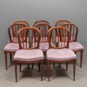 Set van acht mahonie stoelen met spijlen in de rug en lila bekleding, mogelijk Albert Eeltjes (1751-1836), circa 1800 -zittingen verstevigd-, 93 × 53 × 42 cm