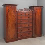 Mahonie kledingkast, bestaande uit ladekast geflankeerd door twee hogere delen met deur, waarachter hang- en legmogelijkheden, Engeland, 19e eeuw -centraal ornament gelijmd, profieltje van lade rechtsonder ontbreekt, enkele kleine andere slijtages-, 206 × 257 × 72 cm