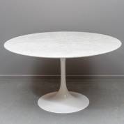 Ronde wit marmeren tafel op wit metalen voet, naar ontwerp van Eero Saarinen, niet gemerkt, uitvoering onbekend -gebruikssporen-, 72 × Ø 127 cm
