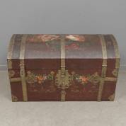 Beschilderde naaldhouten dekenkist met bolle deksel en metalen monturen, het deksel met twee wapenschilden en datering 1777, 62 × 102 × 60 cm