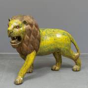 Gesneden houten beeld: leeuw, polychroom beschilderd in geel en goud met groen- en blauwtinten, 20e eeuw -beschadigingen-, 71 × 96 × 30 cm