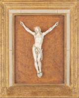 Olifantsivoren Corpus Christi, 18e eeuw, Zuidelijke Nederlanden, op wortelnoten achterplaat gemonteerd -deel doornenkroon ontbreekt, enkele krimpscheurtjes, CITES EU-certificaat bijgevoegd, geen uitvoer buiten de EU-, 33 × 22 cm