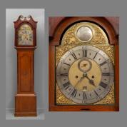 Engels staand horloge in eiken kast, de messing wijzerplaat met seconde- en datumaanduiding, verzilverde cijferring, gesigneerd William Foot, London, ankergang met slagwerk op en enkele bel, 18e/19e eeuw, 205 cm hoog, inclusief slinger, twee gewichten en opwindsleutel