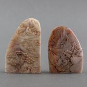 Twee Chinese gesneden spekstenen zegels, beide met landschapsdecor, één met zegel, de ander glad, 20e eeuw -minieme chips-, hoogte 9 cm