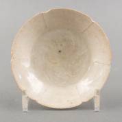Chinese celadon kom met bladdecor, het plat met decoratie, Song -randschilfers-, 3,5 × Ø 14 cm