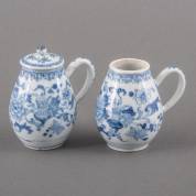 Paar Chinees porseleinen potjes met blauw-wit decor, Qianlong, eentje met niet bijhorende deksel met strooigaatjes -deksel met chips langs de binnenrand-, 6 × Ø 12 cm