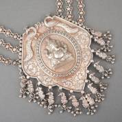 1e gehalte zilveren collier, opgebouwd uit een schild met afbeelding van Ganesha, waaraan bedels in de vorm van pauwen, drie kettingen met bloemvormige schakels, waartussen aan beide zijden drie schildjes met bladdecor, India, 20e eeuw, gewicht 487 gram, 50 cm