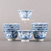 Tien Chinees porseleinen kommetjes met blauw-wit decor: afwisselend bloem en visser aan de waterkant in vakverdeling, Kangxi gemerkt, 19e eeuw -twee haarlijnen en diverse randchips-, 5 × Ø 9 cm