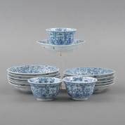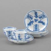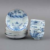 Vijf Chinees porseleinen kommetjes en zes schoteltjes, alle met blauw-wit decor: Chinese muur en pagodes, 18e eeuw -randchipjes, enkele haarlijnen, en één kommetje met barsten-, 4,5 × Ø 8 en Ø 12 cm
