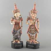 Twee polychroom beschilderde heiligbeelden, één met opschrift 'Srikresne' (Krishna), de ander 'Sri Dewi Djambwati' (Jambavati), Balinees, jaren '20/'30 -verfverlies en restauraties-, hoogte 54 cm