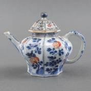 Octagonaal Chinees porseleinen Imari trekpotje met floraal decor, 18e eeuw -dekselknop met glazuurschilfers-, 11 × Ø 9 cm