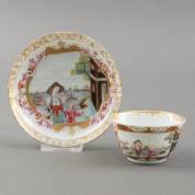 Chinees porseleinen Chine de commande kommetje en schoteltje met famille rose landschapsdecor met twee figuren op de voorgrond, naar Meissen voorbeeld, Qianlong -haarlijnen, randschilfers, beide met rode permanent marker op onderzijde gemerkt '4'-, schoteltje Ø 11,5 cm