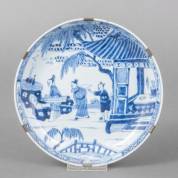 Chinees porseleinen bord met blauw-wit decor van personen in tuin, gemerkt, Yongzheng -randchipje-, Ø 22 cm