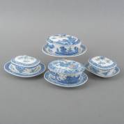 Vier kleine Chinees porseleinen bedekte terrines op onderschotels, met diverse blauw-witte decors, Qianlong -één dekselknop ontbreekt, één terrine staat op afwijkende onderschotel-, 8 × 17 × 14 cm