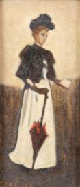 Schilderij: dame met parasol en boekje, marouflé, l.o. gesigneerd J.F. Sterre de Jong, maar vermoedelijk niet van zijn hand, 36 × 16 cm