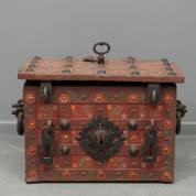 Smeedijzeren geldkist met polychroom bloemdecor, kist 17e eeuw, beschildering van later datum, de binnenzijde van de slotplaat na restauratie gesigneerd 'L.I. v.d. Pluym '46', 37 × 56 × 40 cm