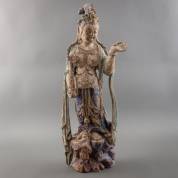 Chinees houten beeld: staande Guanyin met resten van polychromie, Ming-stijl -oude houtwormgaatjes, defecten-, 83 × 30 × 16 cm