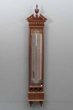 Bakbarometer met contrabarometer en tinnen schaalplaten, tevens voorzien van alcoholthermometer, met Fahrenheit- en Réaumurschaal, in mahonie kast met geblokte biezen en bekroond door vaasvormig ornament, adres: Roselli / Rose, Schiedam, tweede helft 20e eeuw, 131 × 24 × 9 cm
