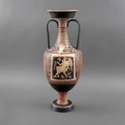 Roodfigurige aardewerk amfoor gehoogd met wit: gevleugelde god, vermoedelijk Eros, daaromheen palmetten, Apulië of Campanië, hellenistische periode, tweede helft 4e eeuw v.Chr. -restauraties en inschilderingen-, 67 × Ø 27 cm, daarbij: op maat gemaakte plexiglas vitrine met spiegelachterwand en muurbeugel