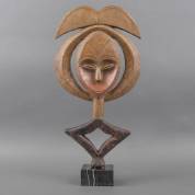Afrikaans houten Janus reliekbewaker, gedeeltelijk met metaal bekleed, op natuurstenen basement, Kota, Gabon -staat wat los op basement-, 56 × 27 × 10 cm inclusief basement