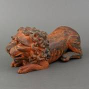 Gesneden houten beeld: liggende leeuw, onderdeel van een roerklik, met resten van polychromie -gerestaureerd, stukje van de manen ontbreekt-, 41 × 20 × 16 cm