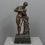 Bronzen beeld op marmeren basement: Silenus met de jonge Bacchus, een verkleinde reproductie van Simon Masière (circa 1648-1720) voor de tuinen van Versailles (1684-1686), naar een reproductie van een Romeins marmeren beeld, met gietersstempel van Parijs -bronzen basement met groene oxidatie-, 58 cm