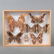 Doos met geprepareerde vlinders, waaronder: Attacus Atlas, Rothschildia Aurota, 40 × 30 × 5 cm