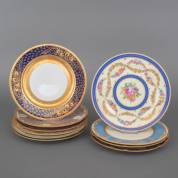 Tien porseleinen sierborden met diverse, deels handbeschilderde, decors, opgehoogd met goud, diverse merken, waaronder: Dresden en Hutschenreuther, 20e eeuw, Ø 28 cm