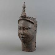 Bronzen beeld: Afrikaans hoofd met tooi, het gezicht met een patroon van verticale lijnen, Ife, Benin, hoogte 48 cm