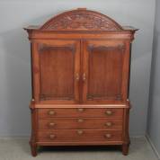 Eikenhouten Drents kabinet met halfronde kap, twee geprofileerde deuren met rozetten in de hoeken, geflankeerd door gezwart houten pilasters, de onderkast met drie lades en staande op taps toelopende poten, Louis Seize, 241 × 170 × 56 cm