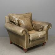 Groen lederen fauteuil met losse kussens, op houten bolpootjes voorzien van wieltjes, 20e eeuw -verkleurd, vlekken-, 90 × 105 × 100 cm