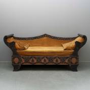 Zwartgeschilderde tweezitsbank met okergele bekleding en gehout decor van draken en leeuwenkoppen, 19e eeuw -gebruikssporen en oude houtwormgaatjes-, 92 × 207 × 68 cm