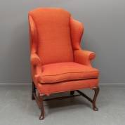 Oorfauteuil met oranjerode gemêleerde bekleding, op houten cabriolepoten, 19e eeuw, 117 × 78 × 58 cm