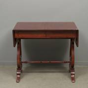 Mahonie tafel met opklapbare zijbladen, liervormige poten en twee lades, 75 × 86 - 130 × 61 cm