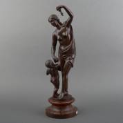 Bronzen beeld: moeder met kind en druiventros, op houten basement, niet gesigneerd, hoogte inclusief basement 51 cm