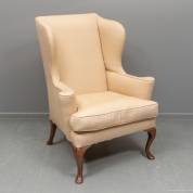 Oorfauteuil met ecru bekleding op eiken cabriolepootjes, 19e eeuw, 113 × 84 × 80 cm