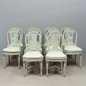 Set van tien grijsgeschilderde eetkamerstoelen met rieten zitting en losse geruite kussentjes, Louis Seize-stijl, 20e eeuw -van twee stoelen elk één achterpoot afgebroken en gelijmd, sommige zittingen wat doorgezakt-, 94 × 44 × 43 cm