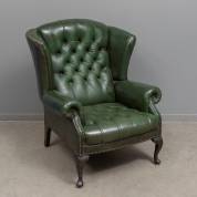 Groen lederen oorfauteuil, Chesterfield-stijl, 20e eeuw -slijtage en deels later bijgekleurd met glimmende laag- , 112 × 87 × 82 cm